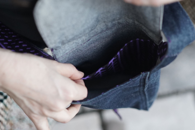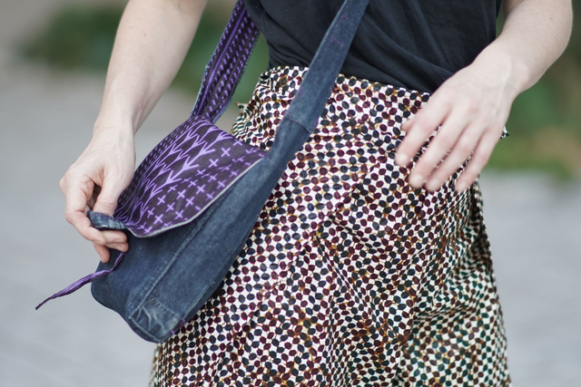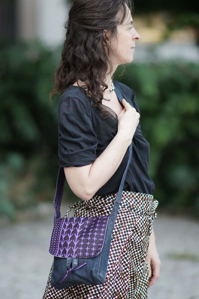 Élégante et originale, cette sacoche unique est confectionnée à la main en jean recyclé et tissu wax violet. Son style bohème chic allie sobriété et caractère, pour un accessoire qui accompagne aussi bien le quotidien que les sorties plus habillées.