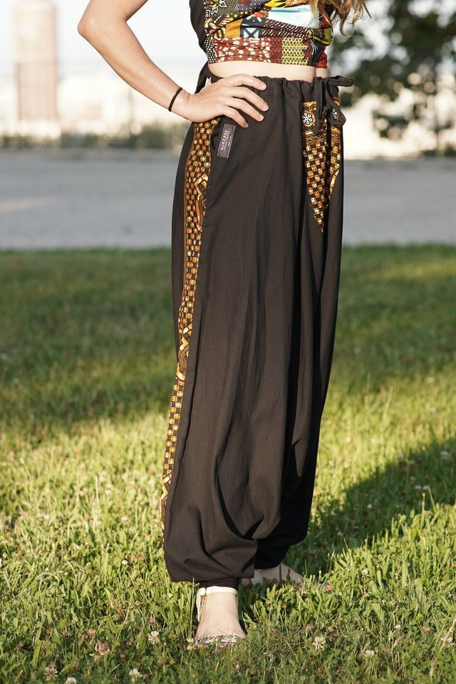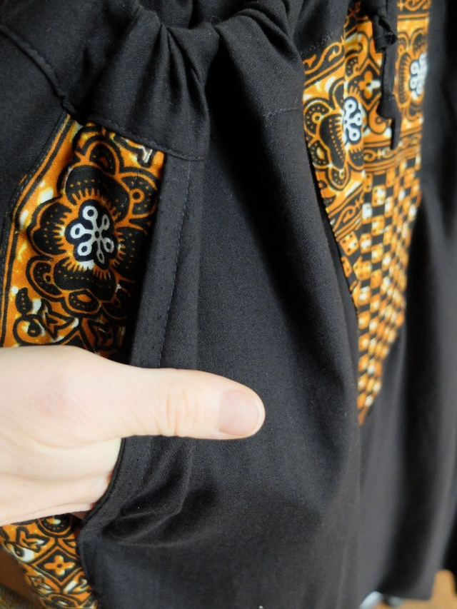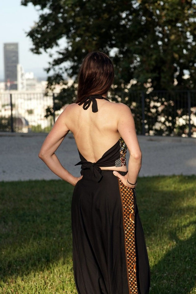 Chaque pièce est unique, réalisée en crêpe de coton bio noir issu des stocks dormants de la région lyonnaise, et sublimée par des touches de wax coloré, collecté en collaboration avec des artisans sénégalais.