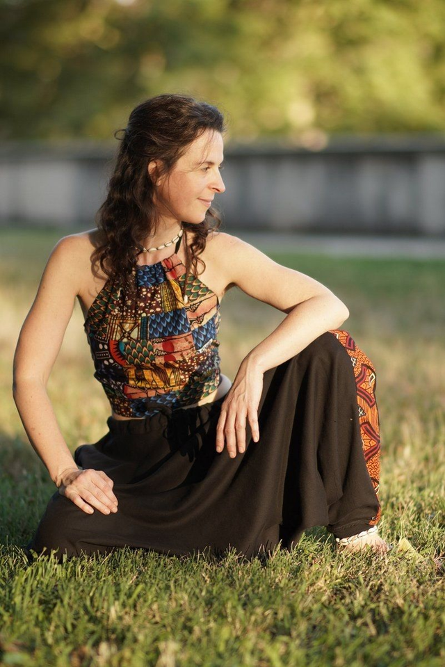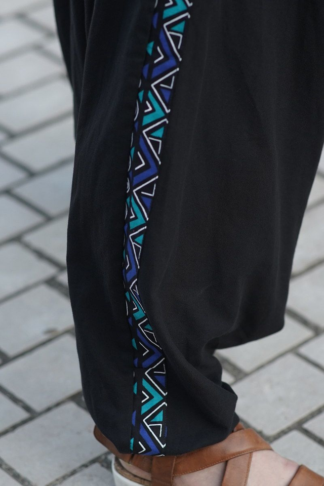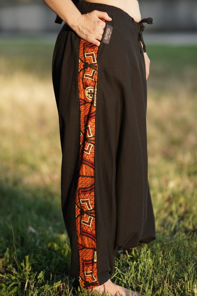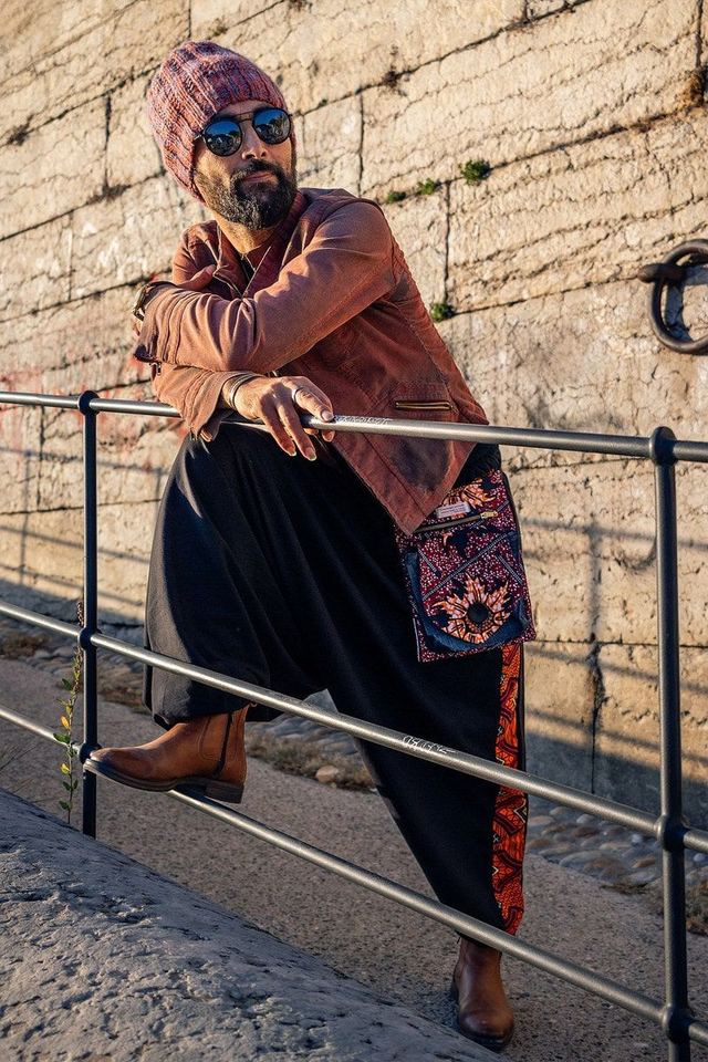 Chaque pièce est unique, réalisée en crêpe de coton bio noir issu des stocks dormants de la région lyonnaise, et sublimée par des touches de wax coloré, collecté en collaboration avec des artisans sénégalais.
